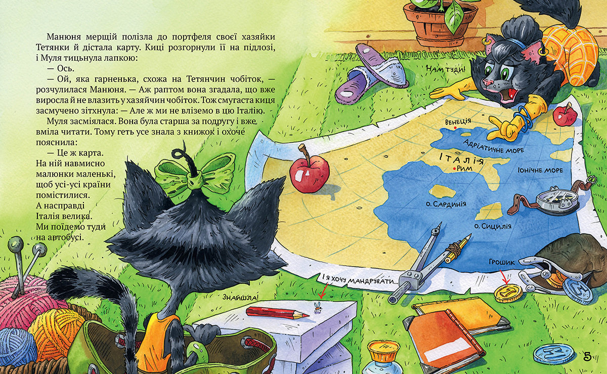 Киці Муля і Манюня так люблять мандрувати! Не подумайте, що на сусідню вулицю, ні! До інших країн! І в кожній з кицями стаються неймовірні пригоди. Хочете помандрувати разом з ними? Читайте про Мулю і Манюню в Італії, Гренландії та Фінляндії!