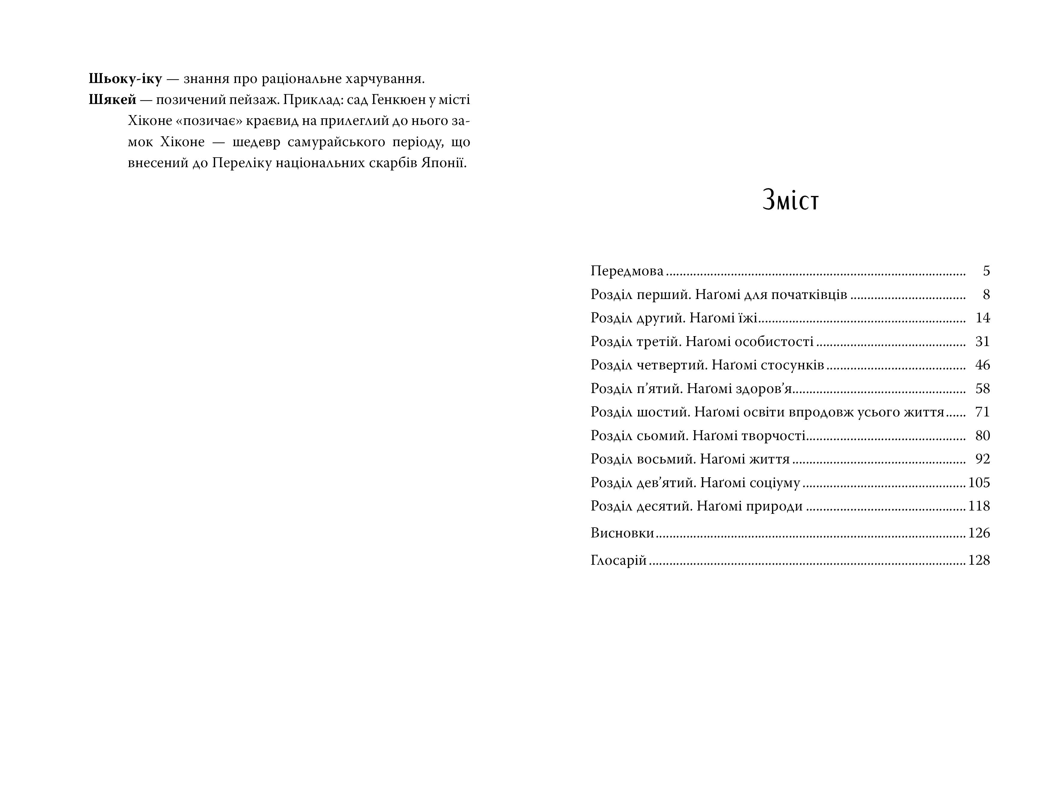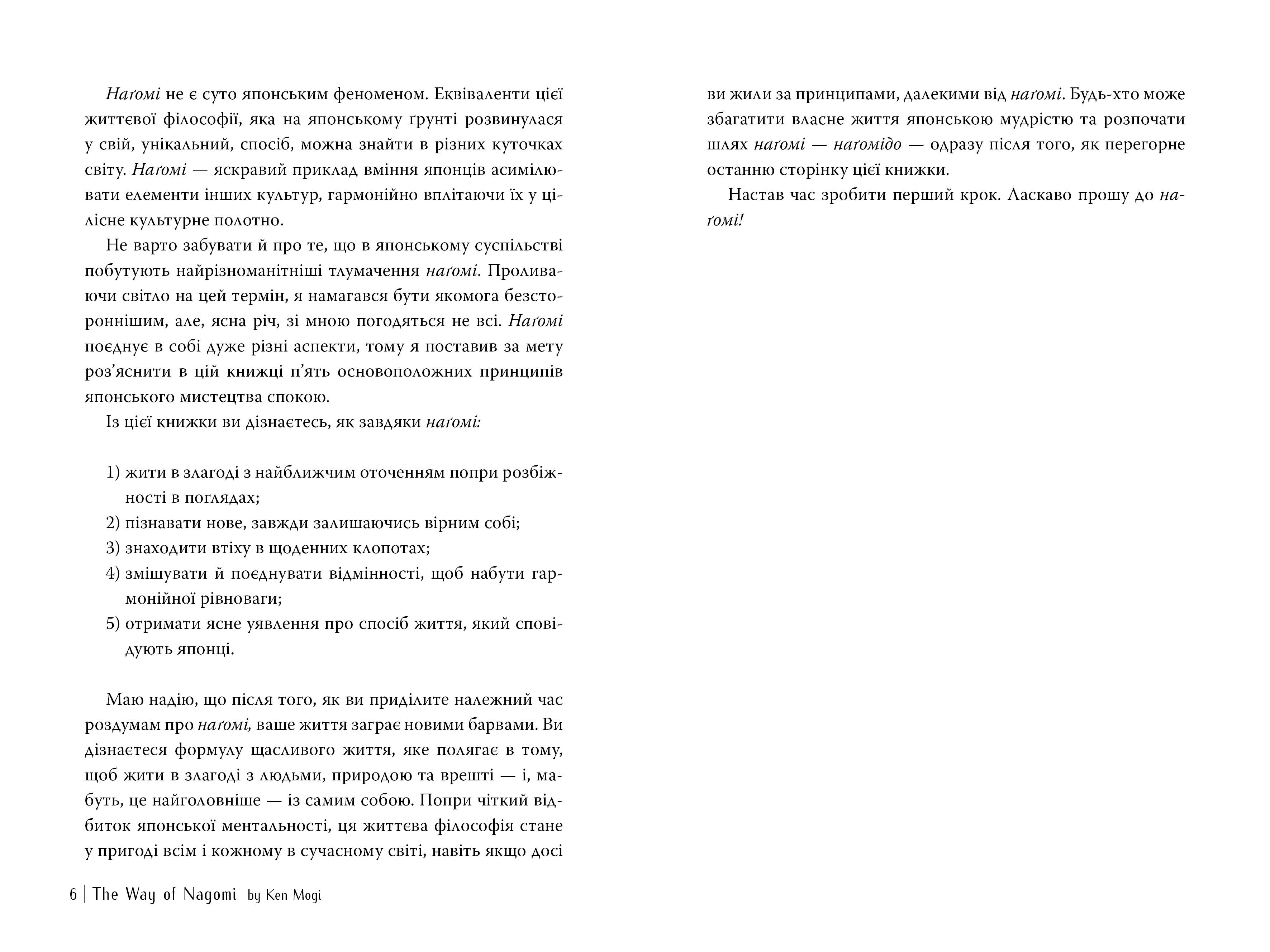 Слово «наґомі» не має точного відповідника в українській мові, але бажано, щоб воно увійшло в лексикон кожної людини. Поняття, закріплене в цьому слові, добре відоме всім мешканцям Японії: набути наґомі означає віднайти спокій та емоційну рівновагу. Ця повсякденна філософія глибоко вкорінена в японській культурі: від способу приготування їжі (поєднання солодкого, солоного, кислого, гіркого й умамі) до звичаю святкувати швидкоплинний сезон цвітіння сакури — скрізь вона залишила свій відбиток.