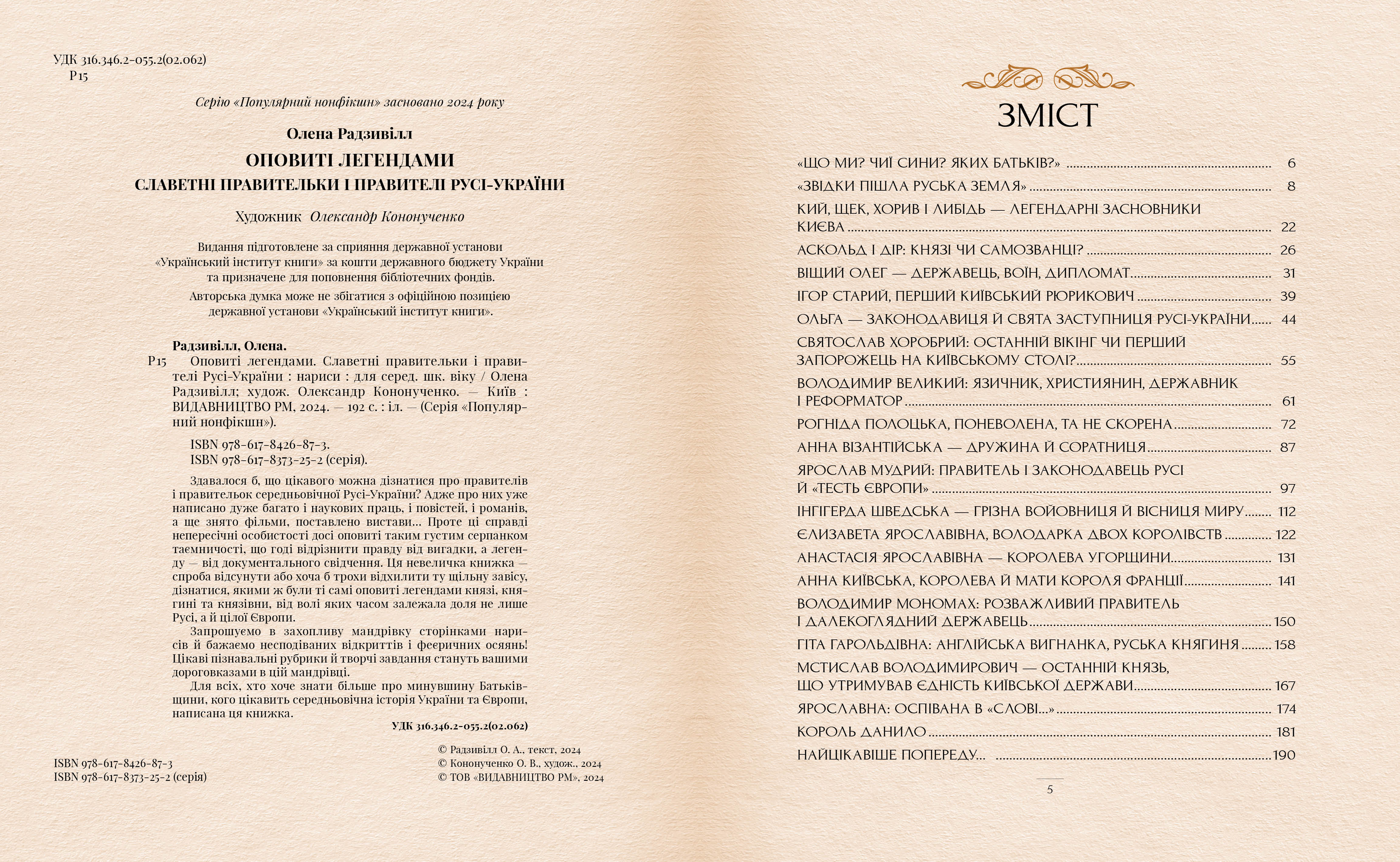 Здавалося б, що цікавого можна дізнатися про правителів і правительок середньовічної Русі-України? Адже про них уже написано дуже багато і наукових праць, і повістей, і романів, а ще знято фільми, поставлено вистави… Проте ці справді непересічні особистості досі оповиті таким густим серпанком таємничості, що годі відрізнити правду від вигадки, а легенду — від документального свідчення. Ця невеличка книжка — спроба відсунути або хоча б трохи відхилити ту щільну завісу, дізнатися, якими ж були ті самі оповиті легендами князі, княгині та князівни, від волі яких часом залежала доля не лише Русі, а й цілої Європи.