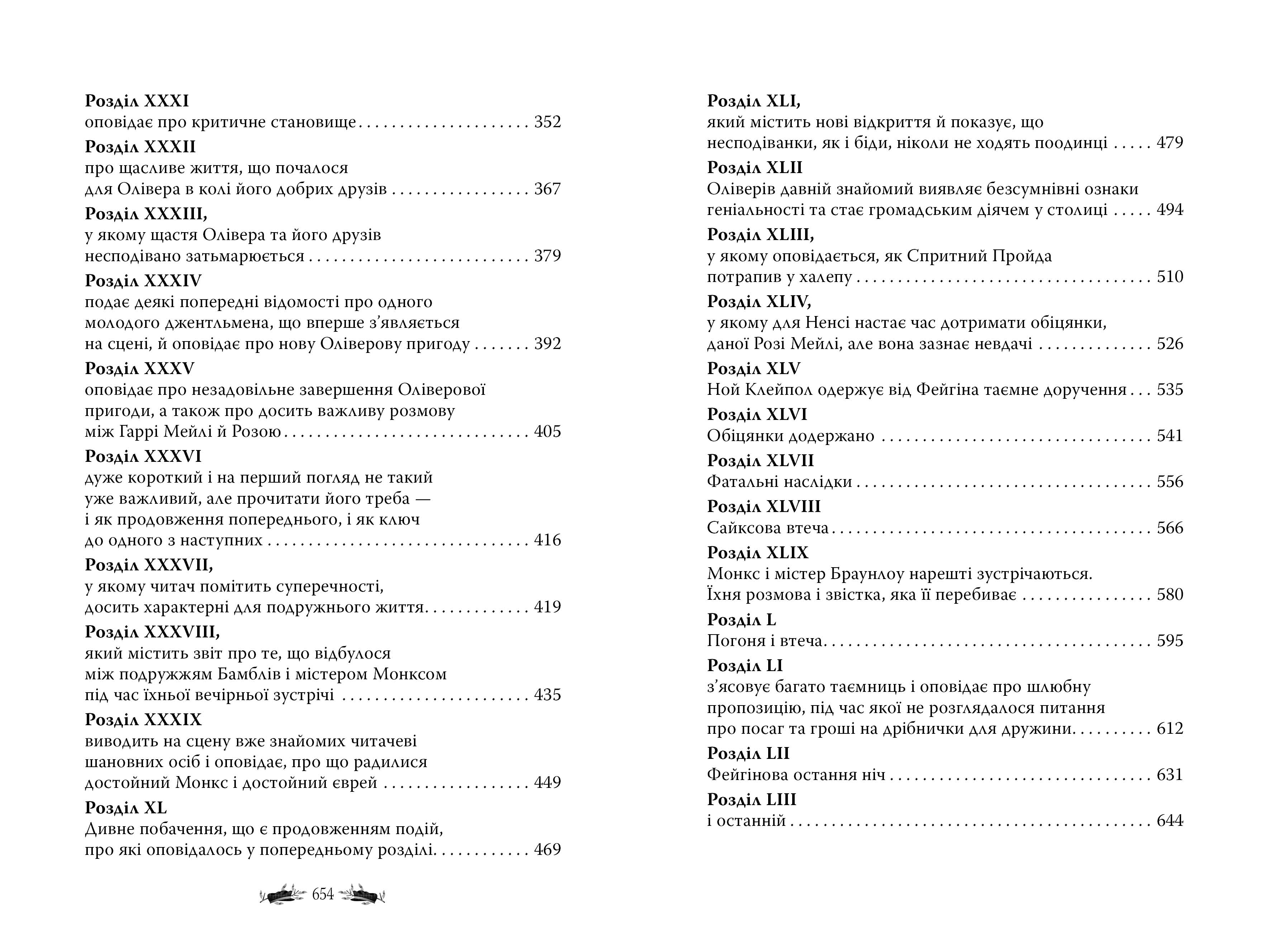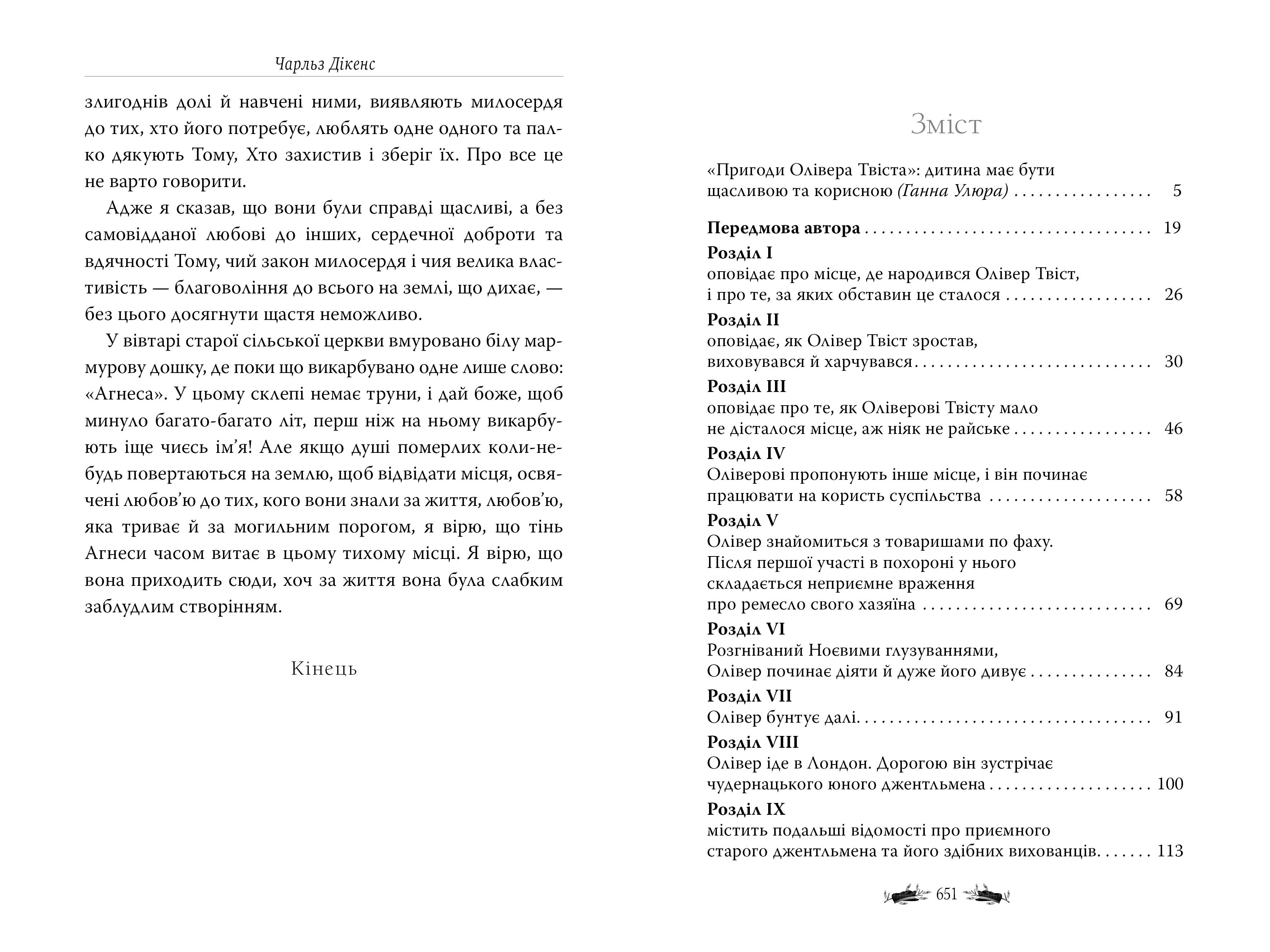 Твір класика англійської літератури Чарльза Дікенса (1812–1870) розповідає про злигодні та поневіряння маленького сироти Олівера Твіста, який виріс у притулку для бідних (так званому робітному домі). Утікши звідти, Олівер потрапляє в лондонські нетрі, де його, як і інших безпритульних, навчають злодійського ремесла. Щаслива розв’язка — Олівера рятує «ідеальний джентльмен», містер Браунлоу, — підтверджує оптимістичну впевненість письменника в перемозі людяності й добра над злом і несправедливістю.