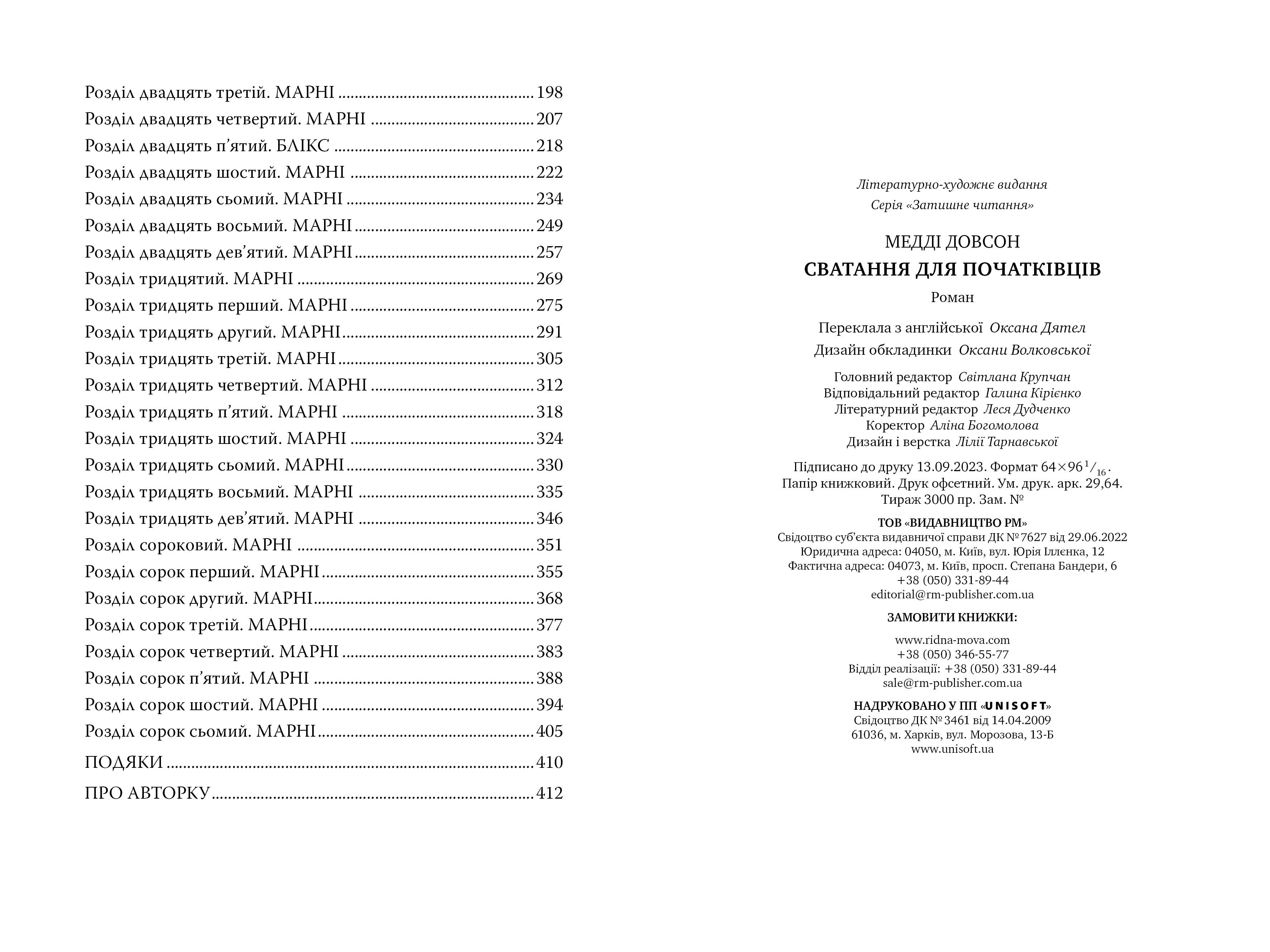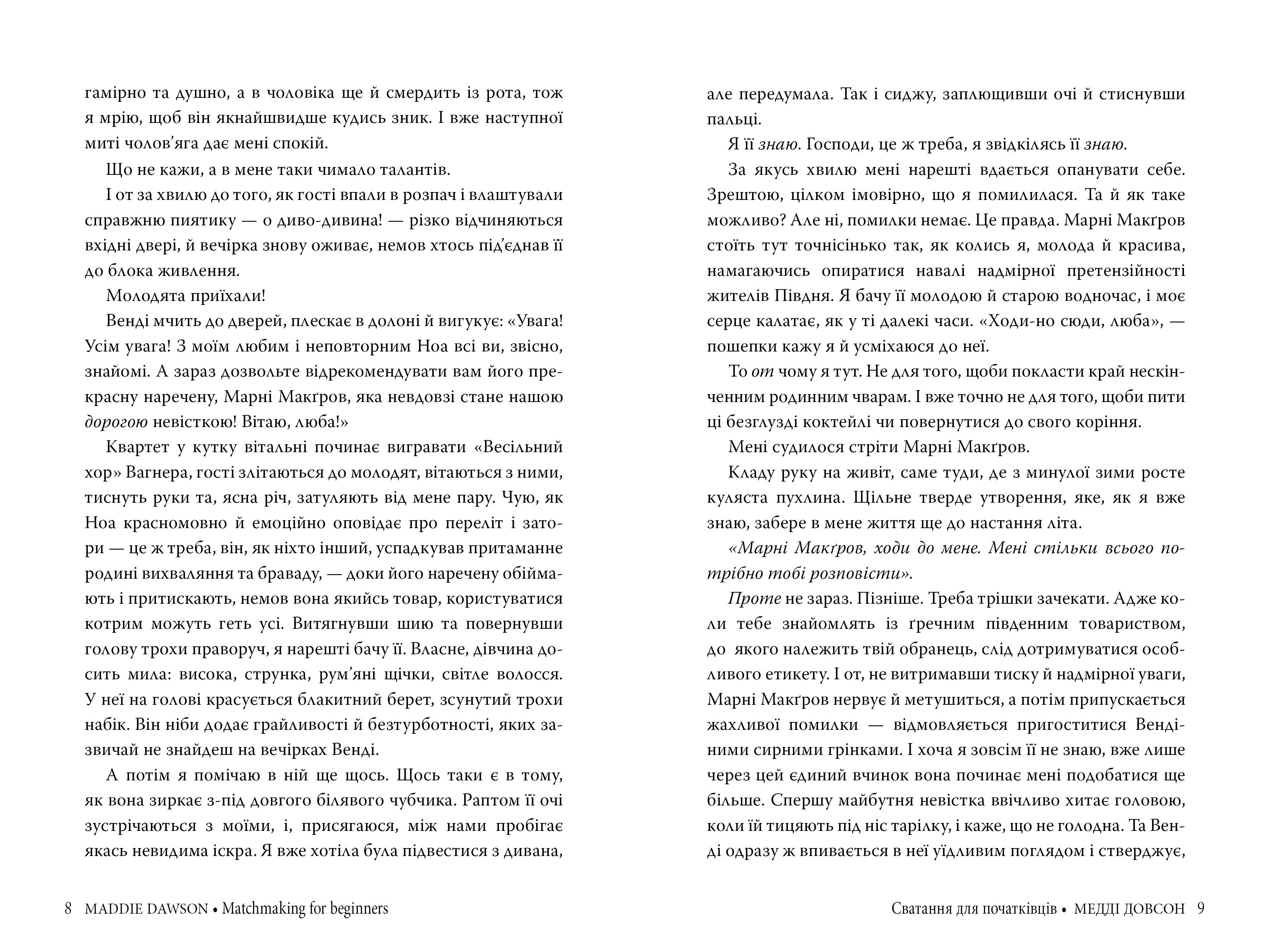 Дилогія американської письменниці Медді Довсон «Сватання для початківців» (Matchmaking for Beginners) та «Щаслива катастрофа» (A Happy Catastrophe) вийдуть друком у 2023-2024 роках. Перекладає Оксана Дятел.